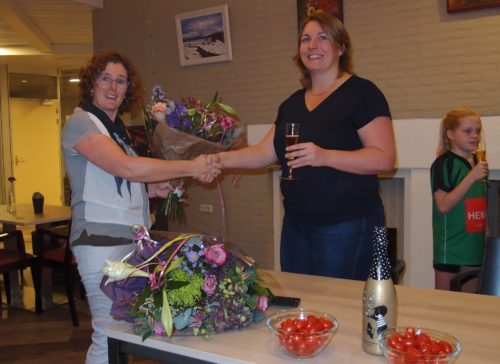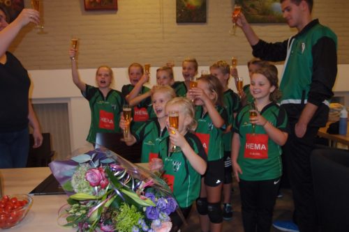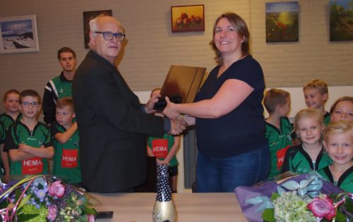 Op de foto’s ondertekenen Maria van den Pol namens Hema Elburg en Bertus Wijnne namens EVV de overeenkomst. Marielle Held overhandigde namens de vereniging een mooie bos bloemen als dank voor de samenwerking. En de mini’s zelf tonen trots de gloednieuwe shirts met sponsornaam.