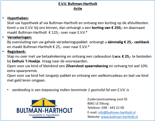 Zoals iedereen inmiddels wel weet is Bultman-Hartholt sinds 1 januari 2018 trotse hoofdsponsor van EVV. Bultman-Hartholt is een onafhankelijke financiële adviesorganisatie met vestigingen in Elburg en in Hattem, gespecialiseerd in alle schadeverzekeringen, levensverzekeringen, hypotheken en bankzaken voor zowel particuliere als zakelijke klanten. Daarnaast is Bultman-Hartholt ook zelfstandig intermediair van de RegioBank.
