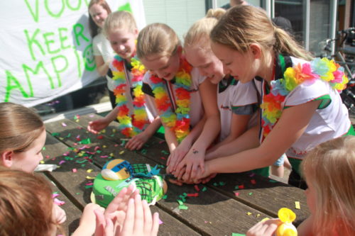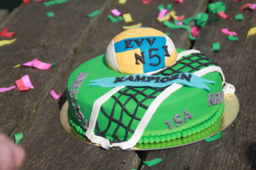 Na de wedstrijd was het tijd voor de medaille die ze in ontvangst mochten nemen. Nadat de confetti kanonnen waren ontploft konden de kinderen beginnen aan de fantastische (door een van de ouders) zelfgemaakte volleybaltaart!