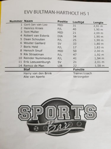 Toen wij zo’n anderhalf uur voor de wedstrijd op het universiteitscomplex in Groningen arriveerden zat de sporthal dan ook al bommetjevol. Enerzijds met noordelijke volleybalmeisjes die de grote Nummerdor nog een keer wilden zien vlammen en voor de andere helft met bronstige studenten die erg benieuwd waren naar onze verzorgster. Helaas moesten we de Donitas-selectie (“Leuk dat jullie er zijn! Waar is de vedette…?”) en de andere aanwezigen melden dat Reinder wegens training voor de Rotterdamse marathon dit keer ontbrak en dat onze verzorgster dienst had in ’t Huiken. Daar maakten we natuurlijk geen vrienden mee. En dat werd er niet beter op toen de Elburgse prutsers geheel tegen de verhoudingen in ook nog met de eerste set aan de haal gingen. Omdat we geen totale party-poopers wilden zijn, besloten we het daarom in de tweede set maar wat te laten lopen. Donitas pakte het leuk op, won de tweede set en was daarmee kampioen geworden. Van de rest van de avond herinner ik me eerlijk gezegd alleen dat die studenten 50 liter bier van hun sponsor kregen en dat niet op konden… Volgens de nevobo-app hebben we tussendoor ook set 3 en 4 verloren. Toen we later de foto’s terugkeken viel op dat Donitas tijdens de wedstrijd wel met érg veel spelers tegelijk in het veld stond. Dan wordt volleyballen wel wat makkelijker natuurlijk. Maar goed, we zijn geen kniesoren…