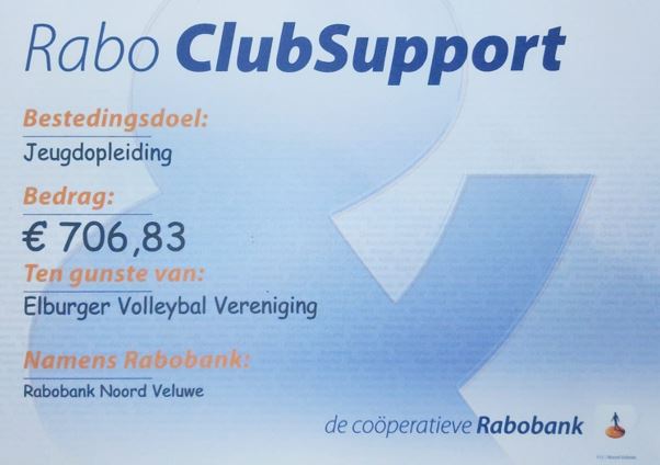 Elk jaar kunnen leden van Rabobank maximaal twee stemmen op hun vereniging uitbrengen om zo de clubkas van de vereniging extra te spekken. Op deze manier geeft de Rabobank een deel van haar winst aan verenigingen door het hele land. In 2020 hebben 30.000 verenigingen en stichtingen in het hele land aan deze actie deelgenomen. De Rabo ClubSupport actie staat open voor verenigingen en stichtingen die klant zijn bij de Rabobank en een maatschappelijk, sportief, recreatief of cultureel doel hebben. Stemmen kunnen worden uitgebracht door leden van de Rabobank vanaf 12 jaar. Elk lid mag 5 stemmen uitbrengen op zijn favoriete verenigingen en stichtingen, waarvan er maximaal 2 op dezelfde vereniging/stichting mogen worden uitgebracht. De Rabobank Noord-Veluwe, waartoe Elburg samen met Nunspeet, Epe, Oldebroek en Heerde behoort, had dit jaar een bedrag van 120.000 € te verdelen onder de 415 verenigingen en stichtingen die zich hadden aangemeld. In onze regio zijn een kleine 40.000 stemmen uitgebracht. Een stem is daarmee goed voor een bedrag van 3,21 €. Afgelopen vrijdag 6 november ontvingen alle deelnemers per post een cheque met daarin het bedrag dat zij uit het ClubSupport fonds mogen ontvangen. Voor EVV vermeldde de cheque het prachtige bedrag van €...