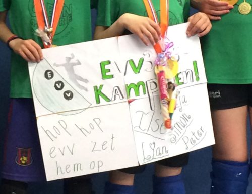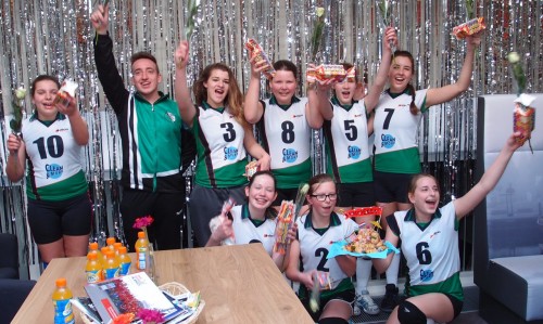 Alweer een kampioen bij de jeugd! Afgelopen zaterdag was het de beurt aan Meisjes C2 om feest te vieren. Een wedstrijd voor het eind van de competitie hadden ze aan een 4-0 overwinning op HVV genoeg om onbereikbaar te worden voor de concurrenten in de 2e klasse H. De dames lieten er in het veld geen twijfel over bestaan wie het beste team was. Via 25-8, 25-13, 25-18 en 25-13 kon de vlag in top bij het team van trainer/coach Stefan de Man. En dat werd na de wedstrijd nog even goed gevierd. Linda, Emma, Lisa, Melissa, Naomi, Cynthia, Sam, Gerriët, Manon en Stefan, van harte gefeliciteerd en op naar de platte kar!!!!